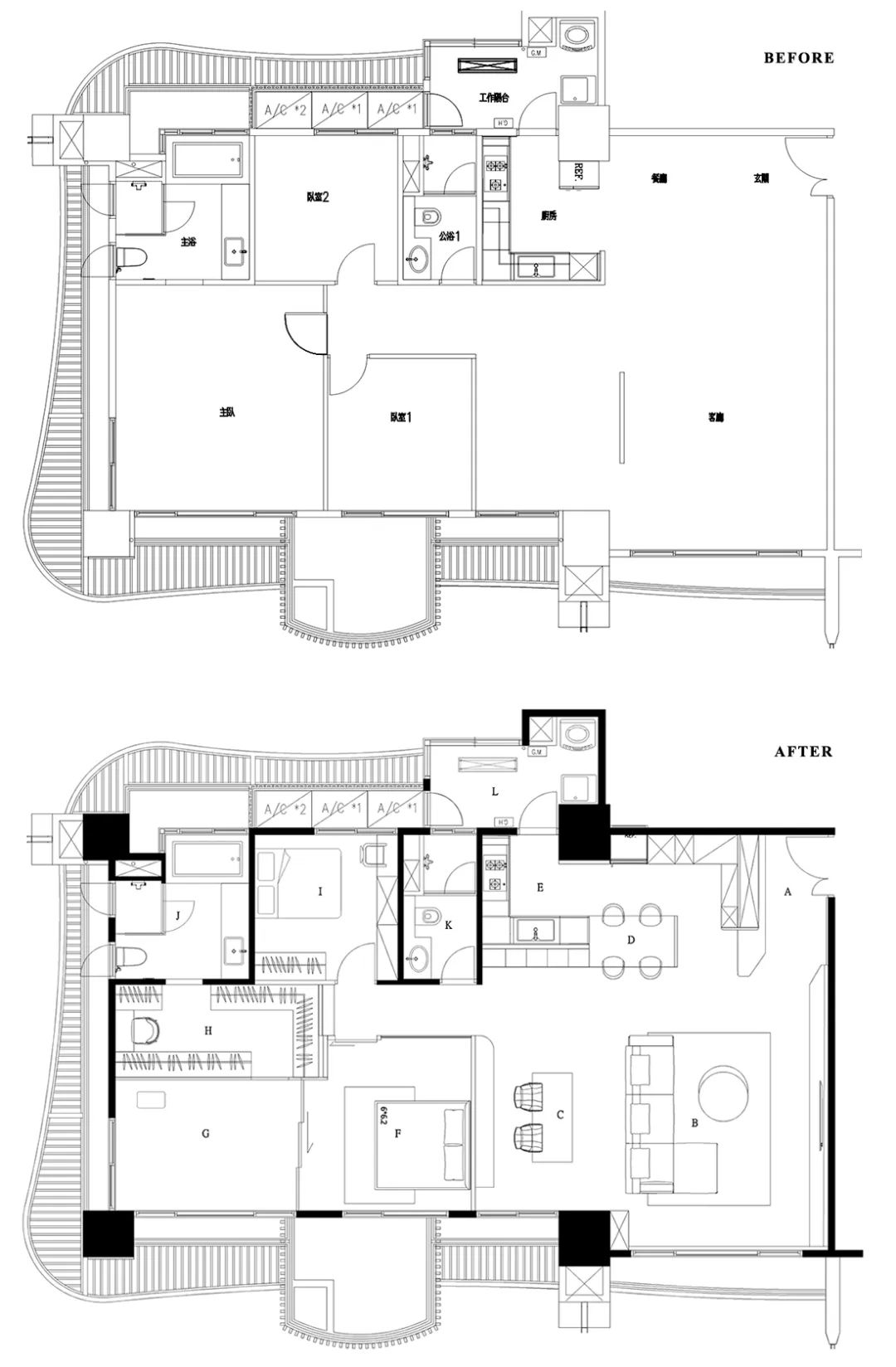 为减少直角疑虑,临廊侧刻意导圆弧收边
