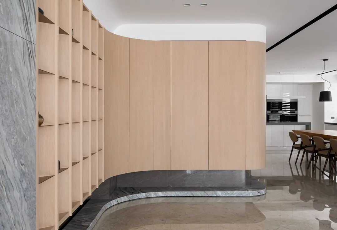 大地色系的木皮连着石材一气呵成