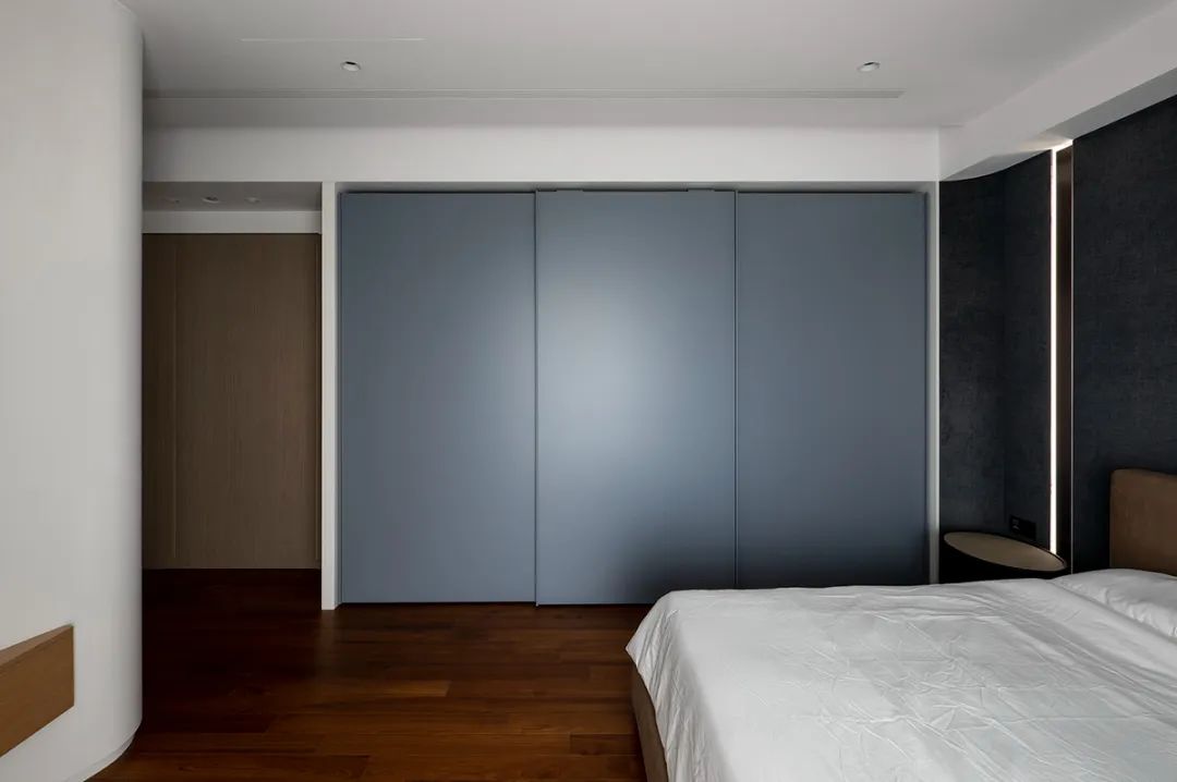床头处铺上织纹感的深蓝色壁纸,流泄沉稳气息