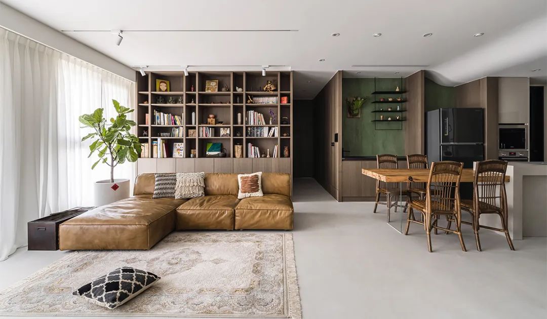 皮革沙发后方以大地棕色木料施作顶天而落的书柜
