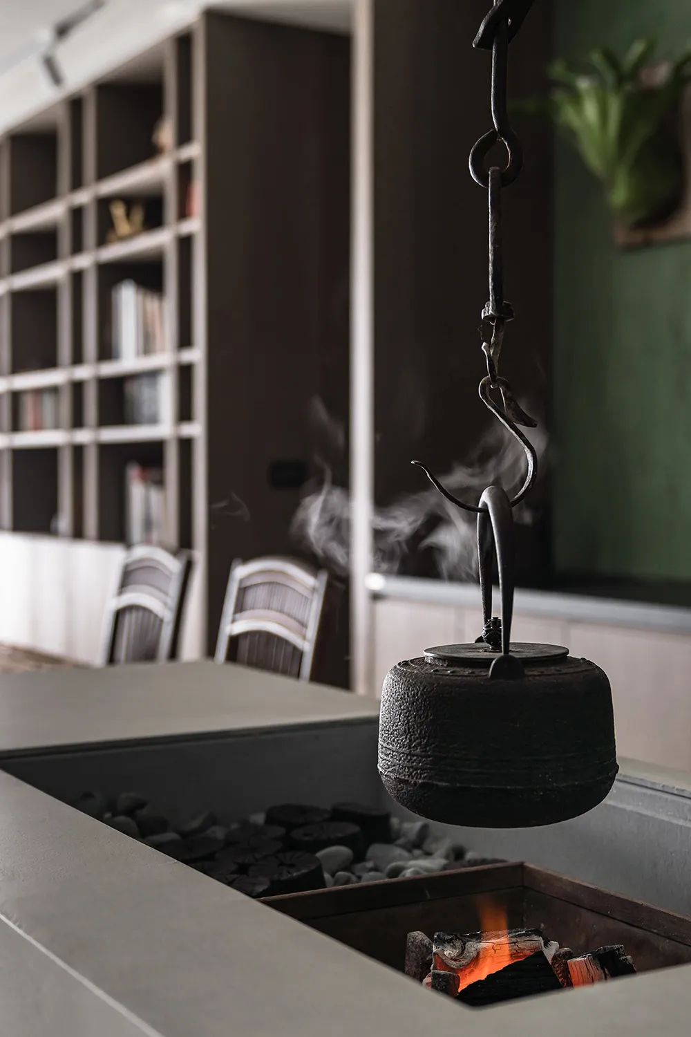 悬挂式的铸铁茶壶在炭火区上沸腾