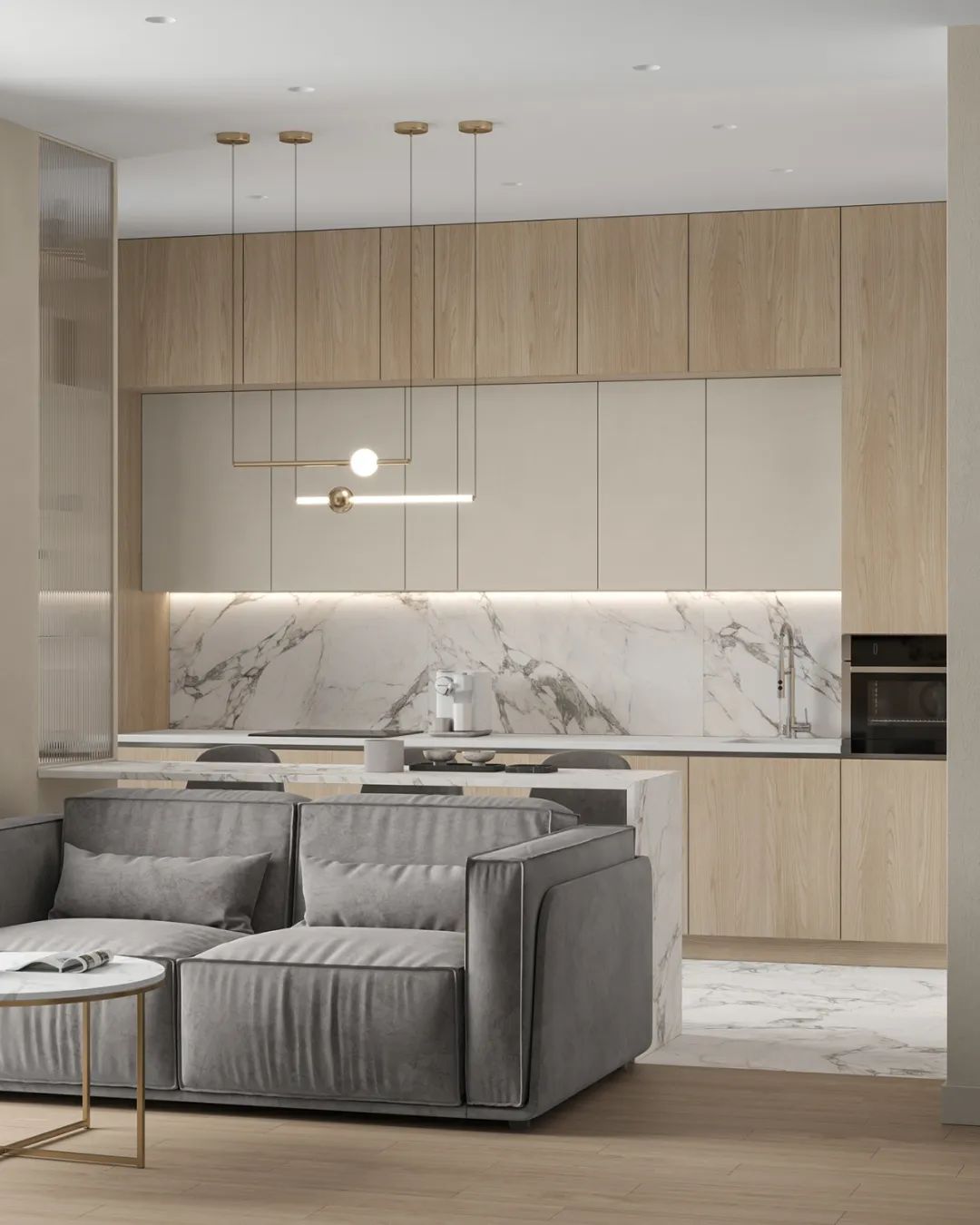柔和的原木色调与奶白,形成了清晰的空间架构。客厅兼具待客、交谈、休闲的功能。餐桌与灰色的沙发相靠,把客厅和厨房相隔开,旨在将烹饪美食的喜悦。