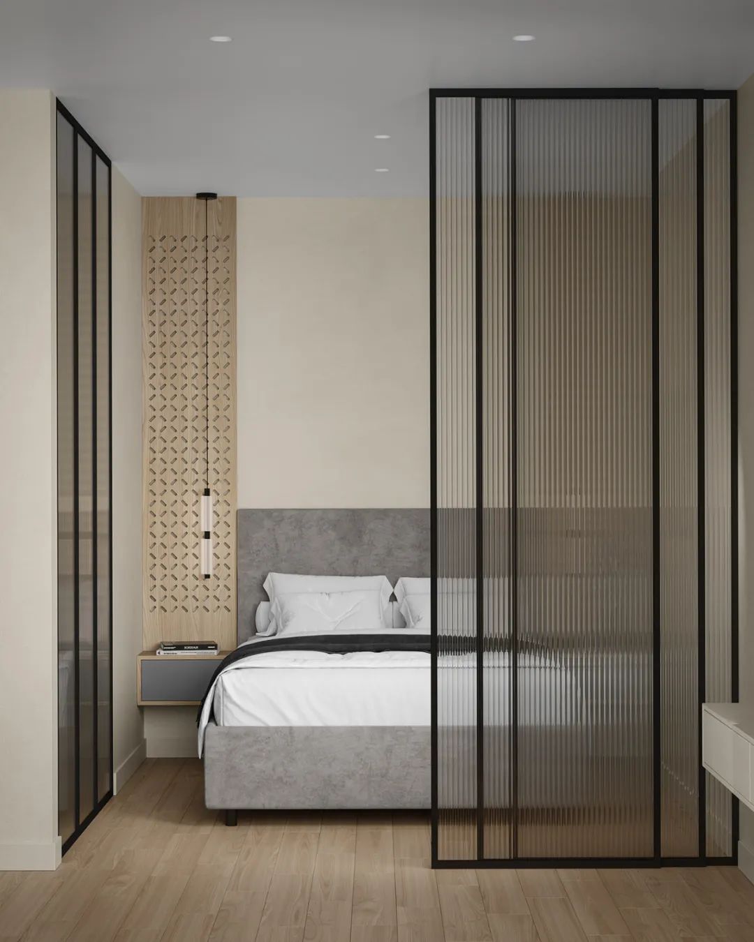 设计师采用黑色金属边框的玻璃门,在界定卧室空间的同时又能让光线映入,不会影响空间的通透感,光线传递畅通无阻,放大空间的视觉感。