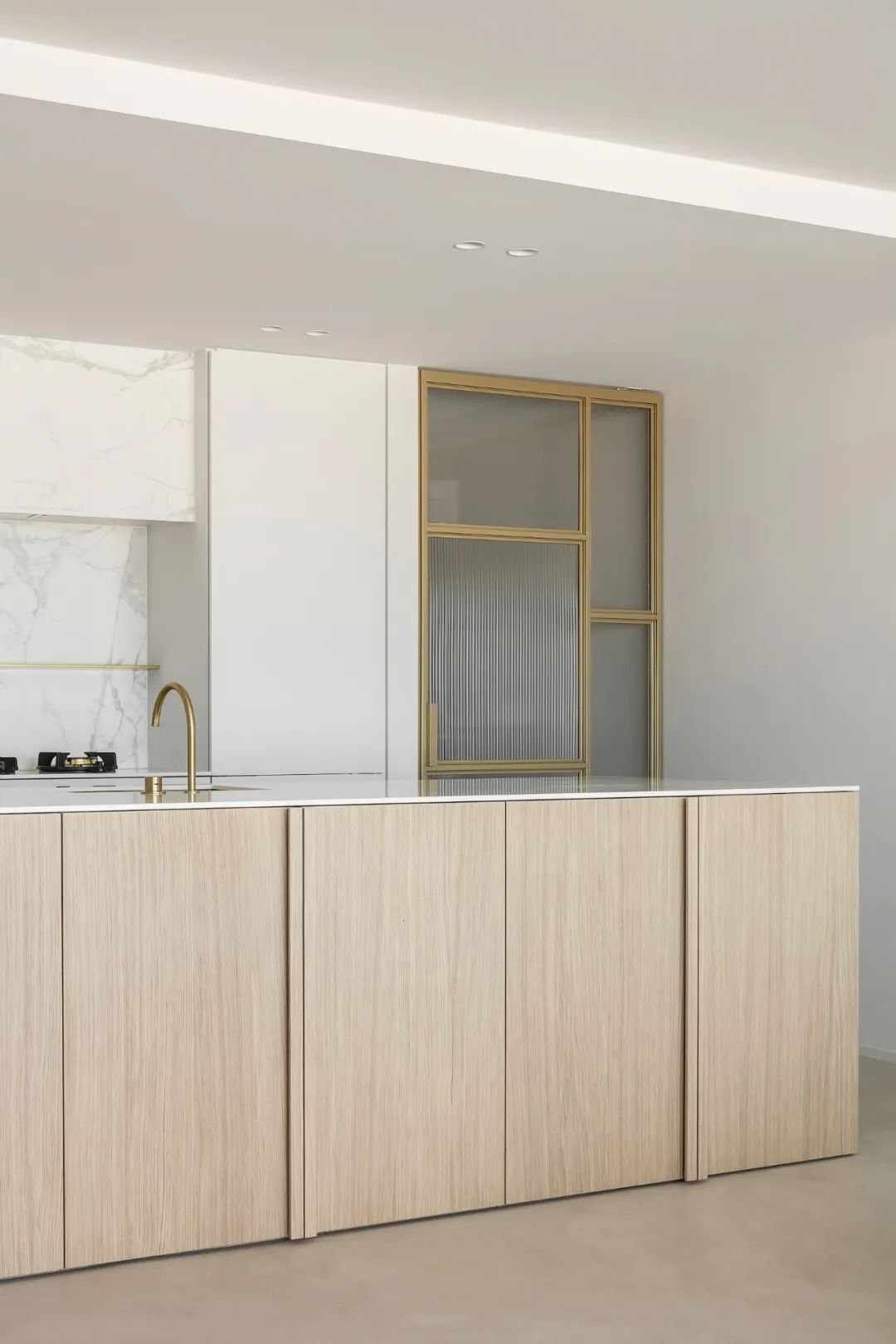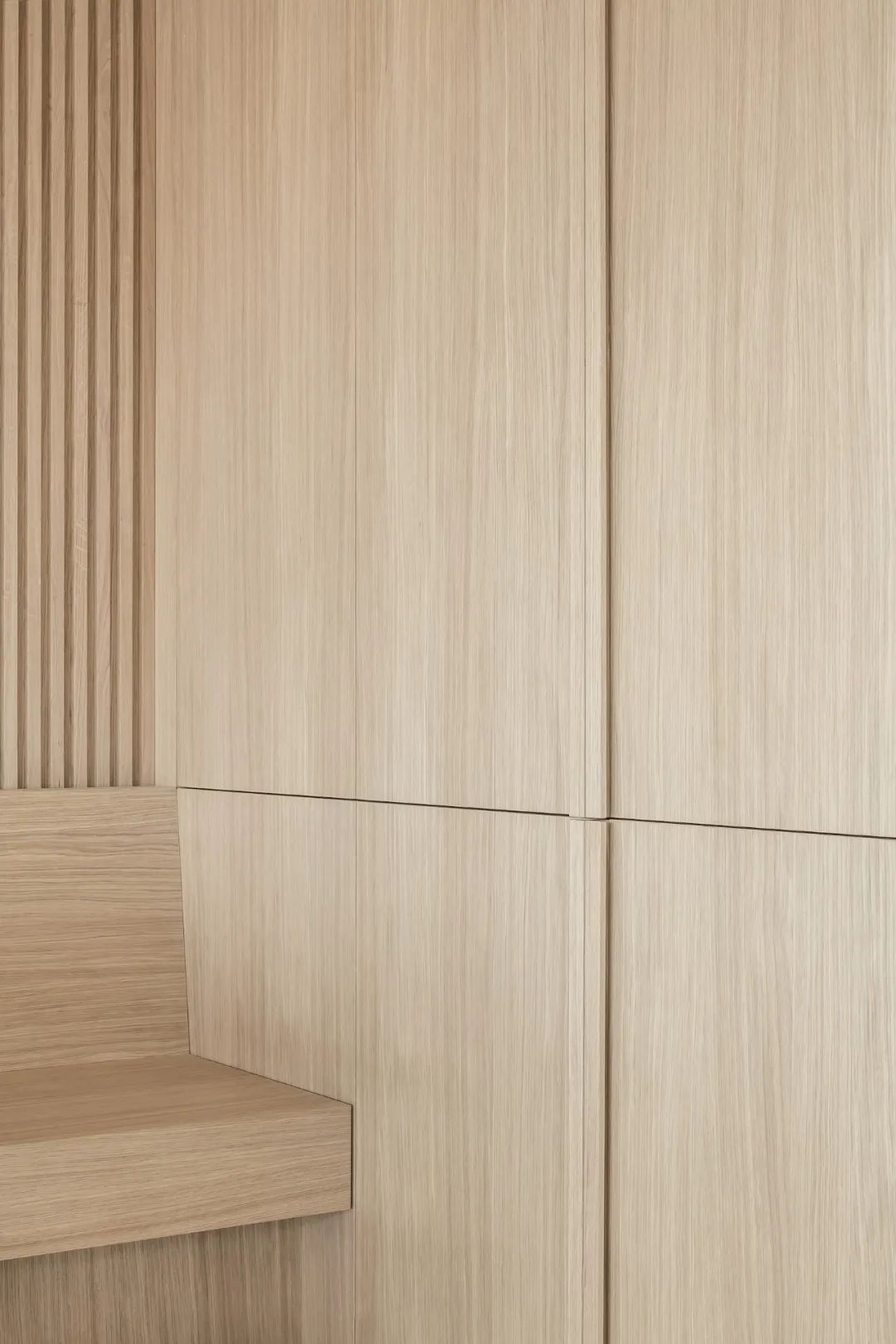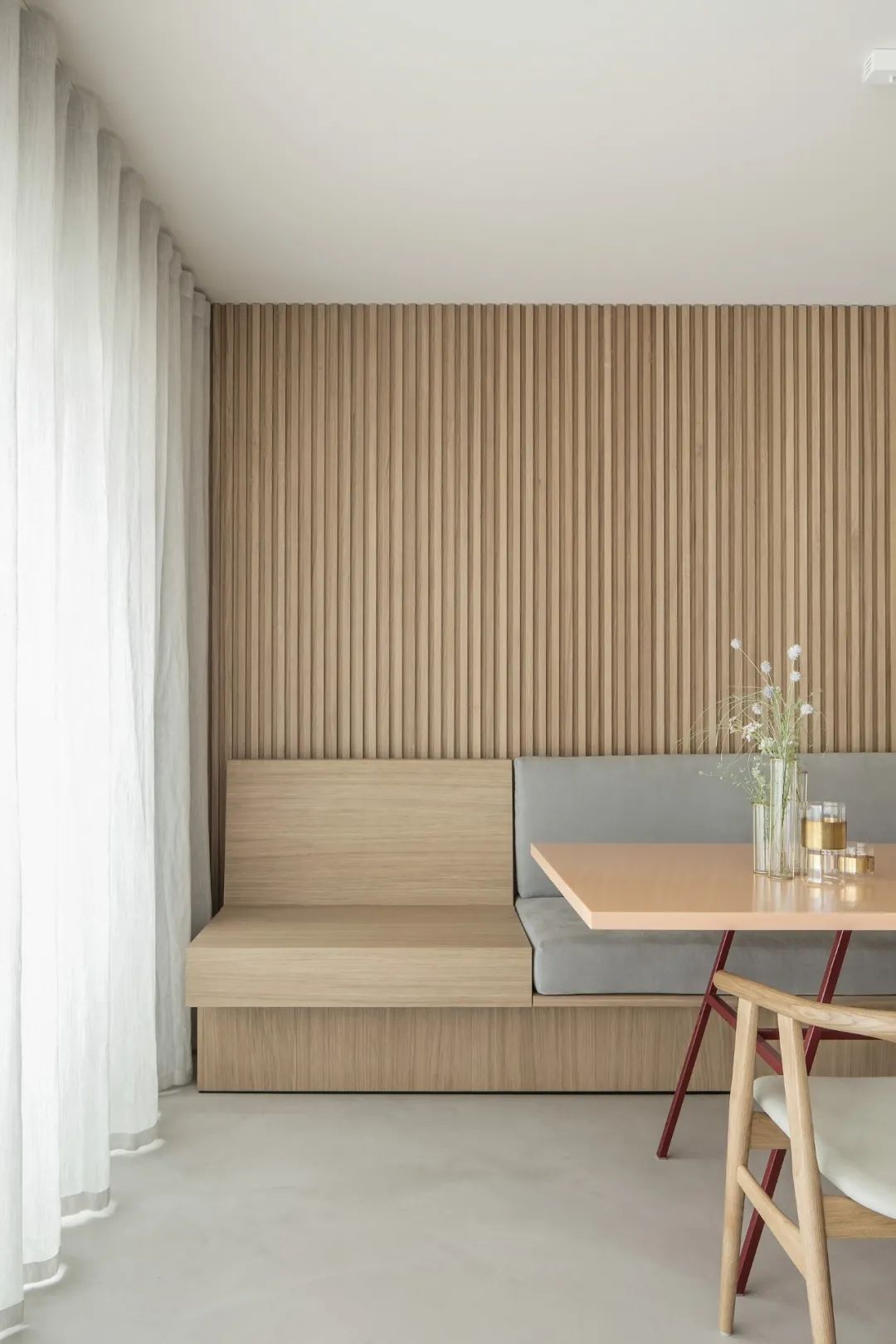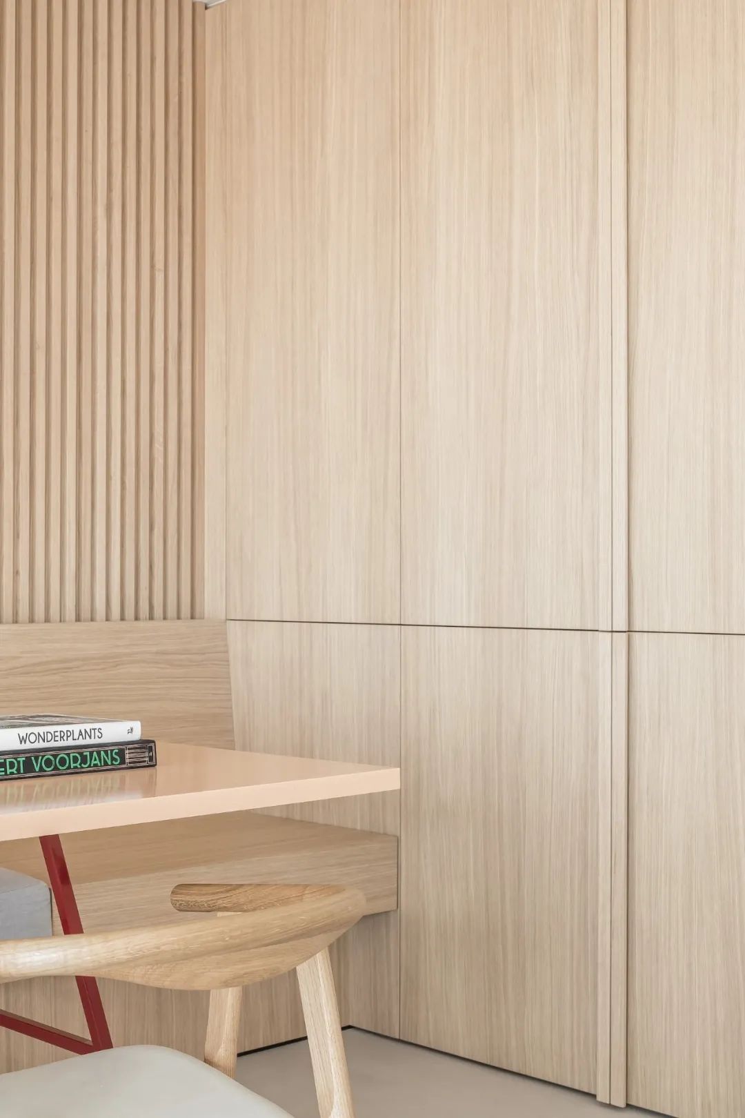Nils Van der Celen是一名比利时室内建筑师,他是一个细节控,对建筑,室内装饰和家具设计以及艺术科学的所有其他领域充满热情。他的作品融合了清晰而简单的概念与俏皮的设计,以创造与用户或客户的完美互动。 LC住宅 RESIDENCE LC “极简的基本就是简单、纯朴,但简单却缺乏深度仅能称呼为廉价,室内空间的设计只有简单是不够的。”——Nils Van der Celen Residence LC是位于比利时克诺克的极简主义住宅,由Nils Van der Celen设计。客户和设计师的愿望是保持外部和内部之间的关系平静,并尽可能减少对比。这宁静和简单通过自然且稳定的材料而展现出来。 室内的主要材料是轻质橡木单板,它带有垂直纹理,并且结合了陶瓷石材,与水磨石形成有趣的色彩组合。家具也代表了设计师的总体观念。 厨房被设想为一个带有集成长凳和厨房岛的“大型家具展示区”,厨岛与橱柜被设计成一体,表面覆以原木,使人在室内就可以吸纳自然之气。 公寓独特而优雅的感觉来自于丰富的材料组合,从厨房便可发现其中的奥秘。厨房防溅板中的水龙头、水槽和百叶窗架都是黄铜装饰的延伸,又如岛台的大理石饰面映衬出主人高雅的品味。 卧室最引人注目的是由垂直木板条制成的后墙,为原本中性的墙壁增添了额外的活力。这一概念延伸到其他两间卧室,当然重点依旧是主卧室,其中床延伸到主浴室的实木家具中。 儿童浴室选择了步入式淋浴间,搭配自然外观的微型台面,以及不同颜色薄片的水磨石洗脸盆,这些薄片是阳光海滩生活的延续,通过贝壳和石头的再现,来表现出度假一般的休闲心情。这种闲逸又简单的生活态度也正是Residence LC致力传达的生活真谛。