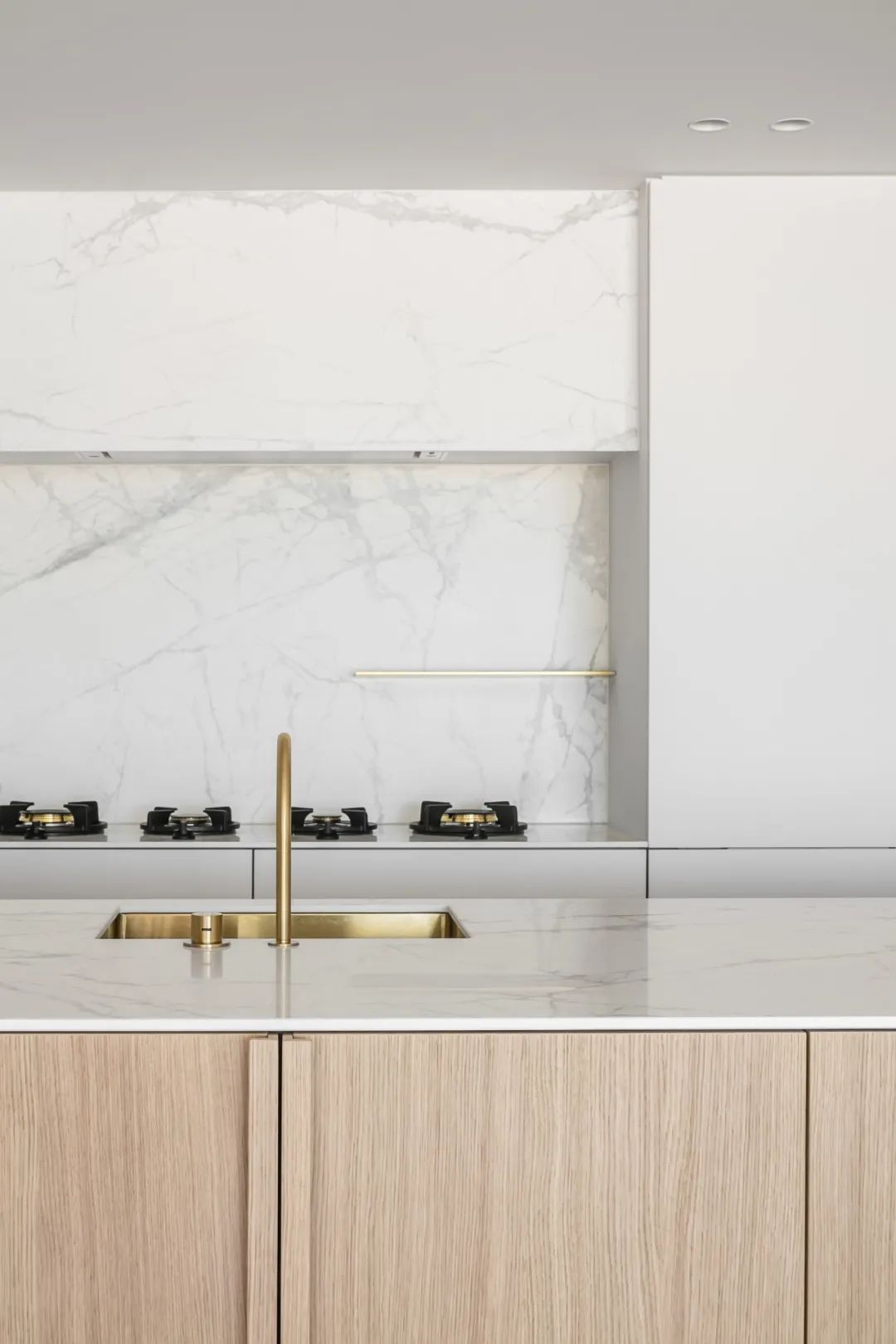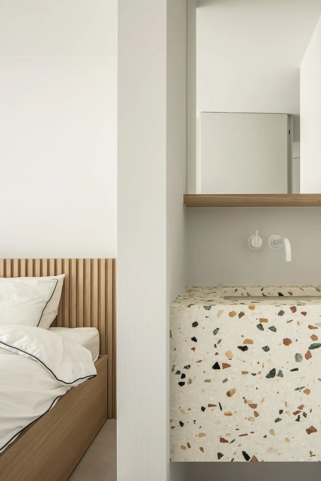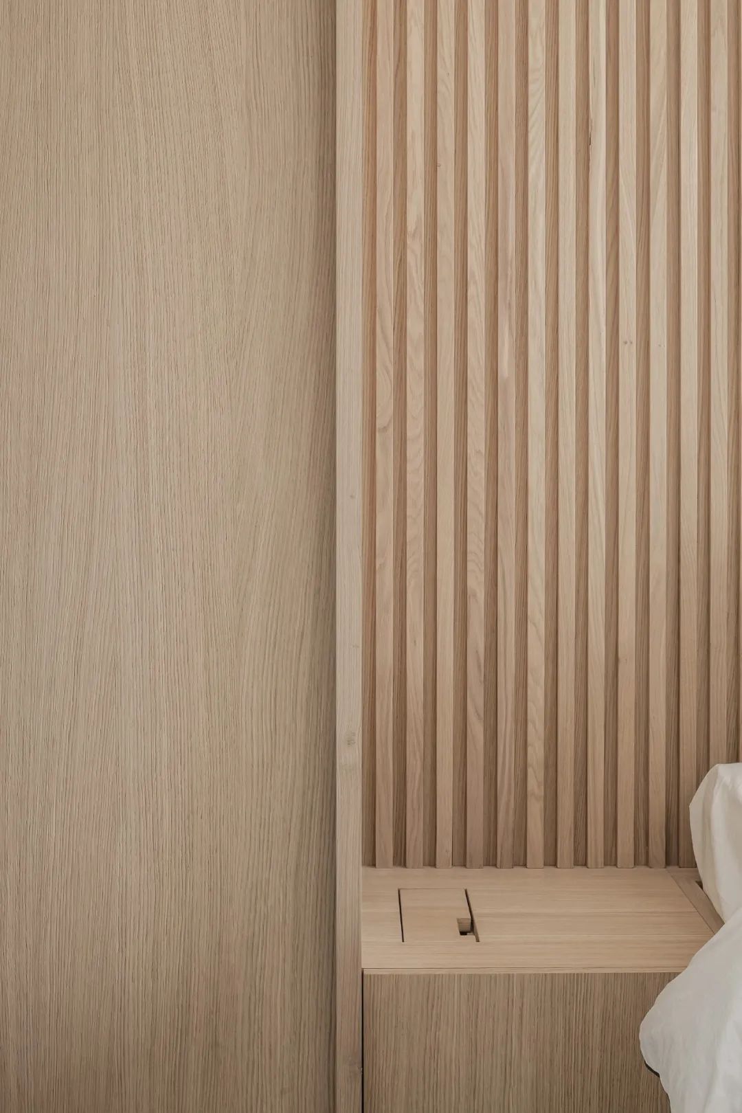 Nils Van der Celen是一名比利时室内建筑师,他是一个细节控,对建筑,室内装饰和家具设计以及艺术科学的所有其他领域充满热情。他的作品融合了清晰而简单的概念与俏皮的设计,以创造与用户或客户的完美互动。 LC住宅 RESIDENCE LC “极简的基本就是简单、纯朴,但简单却缺乏深度仅能称呼为廉价,室内空间的设计只有简单是不够的。”——Nils Van der Celen Residence LC是位于比利时克诺克的极简主义住宅,由Nils Van der Celen设计。客户和设计师的愿望是保持外部和内部之间的关系平静,并尽可能减少对比。这宁静和简单通过自然且稳定的材料而展现出来。 室内的主要材料是轻质橡木单板,它带有垂直纹理,并且结合了陶瓷石材,与水磨石形成有趣的色彩组合。家具也代表了设计师的总体观念。 厨房被设想为一个带有集成长凳和厨房岛的“大型家具展示区”,厨岛与橱柜被设计成一体,表面覆以原木,使人在室内就可以吸纳自然之气。 公寓独特而优雅的感觉来自于丰富的材料组合,从厨房便可发现其中的奥秘。厨房防溅板中的水龙头、水槽和百叶窗架都是黄铜装饰的延伸,又如岛台的大理石饰面映衬出主人高雅的品味。 卧室最引人注目的是由垂直木板条制成的后墙,为原本中性的墙壁增添了额外的活力。这一概念延伸到其他两间卧室,当然重点依旧是主卧室,其中床延伸到主浴室的实木家具中。 儿童浴室选择了步入式淋浴间,搭配自然外观的微型台面,以及不同颜色薄片的水磨石洗脸盆,这些薄片是阳光海滩生活的延续,通过贝壳和石头的再现,来表现出度假一般的休闲心情。这种闲逸又简单的生活态度也正是Residence LC致力传达的生活真谛。