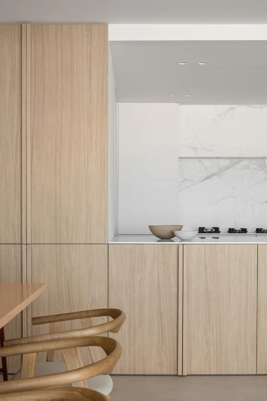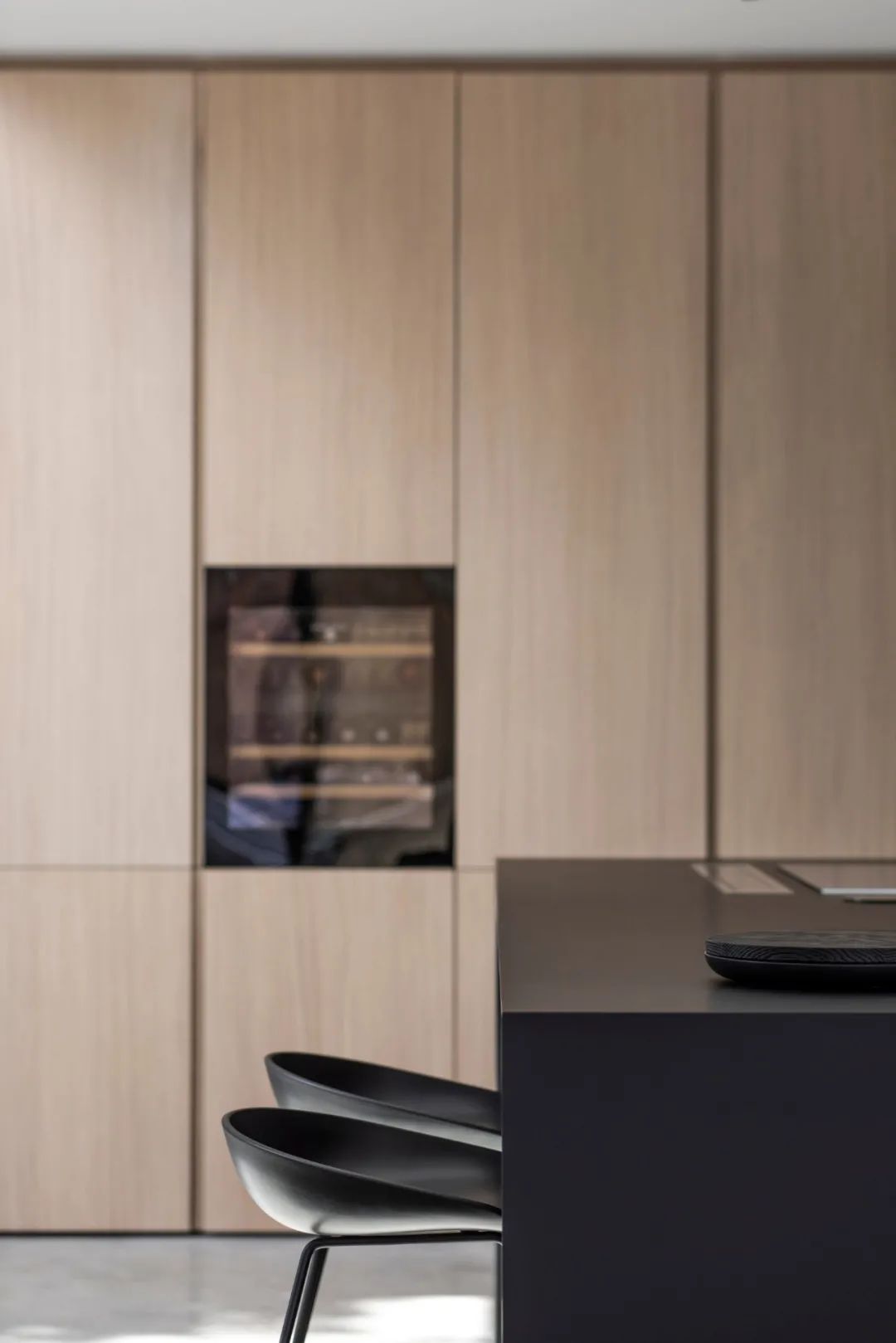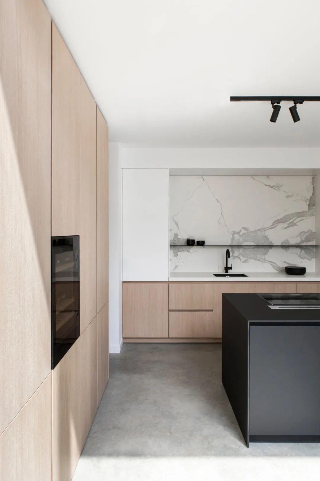 小圆住宅 BUN RESIDENCE “极简不应该和冷漠对等起来,或许我们可以另辟蹊径,在极简主义中加入一些热情与俏皮的元素。”——Nils Van der Celen BUN Residence位于比利时克诺克(Knokke),是Nils Van der Celen经手的最小改造项目。这座住宅有着六十多年的历史,在改造过程中加入了宁静和灵活,并且以此为核心,以表现出家庭的感觉。 橡木单板在室内营造出温暖的氛围,并且为家具的整体性注入新活力,使内部呈现出永恒的经典。打破生活区现有的独立空间来优化平面,以便在餐区和生活区之间建立更多联系。为了能够尽可能灵活地使用空间,这些都配备了一个连续的沙发。 虽然空间出于一个开放型的布局,每个区域却有着自己的关键词。厨房尽可能减少了木板的使用,用浅色水磨石与抛光饰面进行拼接,在视觉上扩大空间的体积感,又运用简单有力的线条表现出应有的秩序感。 卧室分为主套房和 2 间带独立淋浴间的客房。选择了一种非常轻盈、自然和宁静的材料包,适合海岸的自然环境。 地板是定制的,材料混合了带有贝壳的石灰粘土,独特而别具风情,为室内空间的整体腔调锦上添花。Nils Van der Celen的这个作品为我们生动展示了一个宁静又舒适的现代空间。 PA 住宅 PA RESIDENCE “简约和简单都是一种生活态度。我们致力于让居住空间呈现出一种更简洁、更宁静、更清新的生活态度。”——Nils Van der Celen PA Residence位于比利时哈瑟尔特(Hasselt),由由Nils Van der Celen进行翻修。客户希望拥有大量的光线和尽量少的材料,这也是哈瑟尔特 PA 项目的起点。 室内选择的材料与浅橡木有着很高的适配性,并且混凝土与白黑等基本色交替出现,延伸到室内的每一个角落。 厨房和起居空间都是开放式的,两个区域通过连续的墙壁连接起来,大理石防溅墙的水槽、水平钢带的内置燃气壁炉、隐藏的电视壁龛以及Circus Wood 椅为空间增添品牌的乐趣,同时表现出了现代主义空间的特质。 厨台深邃的黑色与周围明亮而清新的白形成鲜明的对比。质感的触感在指尖滑过,冰冰凉凉如电击般触动人的心弦。唯有真正地、切身地处于这个极简又温柔的空间,才能真正感受到这些材料与色彩存在的意义。